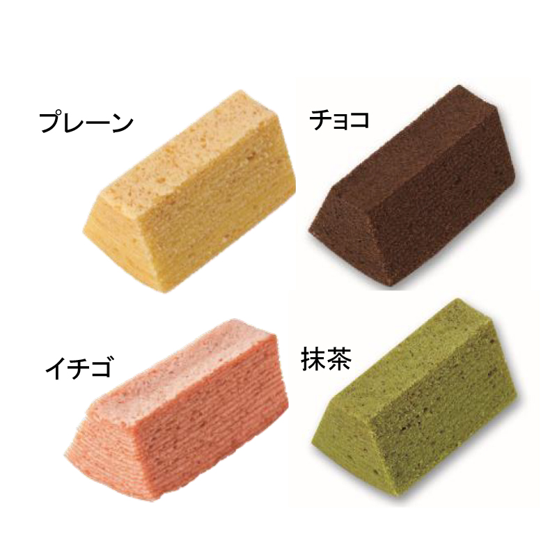 | カラー・種類 | カットバウムクーヘン(プレーン)1個 /カットバウムクーヘン(イチゴ)1個/ カットバウムクーヘン(チョコ)1個 /カットバウムクーヘン(抹茶)1個 |