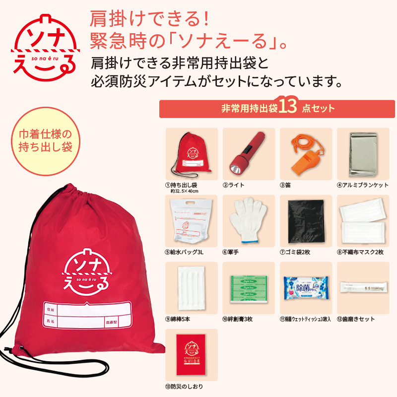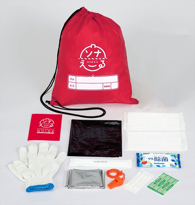 | 材質 | セット内容/持ち出し袋、ライト、給水バッグ、アルミブランケット、不織布マスク2枚、笛、軍手、綿棒5本、絆創膏3枚、除菌ウェットティッシュ10枚入、歯磨きセット、ゴミ袋2枚、防災のしおり |