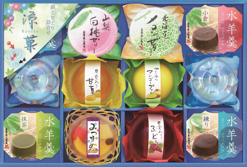 | カラー・種類 | 水羊羹練り 60g×2個、水羊羹小倉 60g×1個、水羊羹抹茶 60g×1個、輪島塩ぜりぃ 58g×2個、みつ豆ゼリー 75g×1個、プレミアムマンゴープリン 75g×1個、果実入り甘夏ゼリー 75g×1個、果実入りぶどうゼリー 75g×1個、北海道メロンゼリー 52g×1個、山梨白桃ゼリー 52g×1個 |