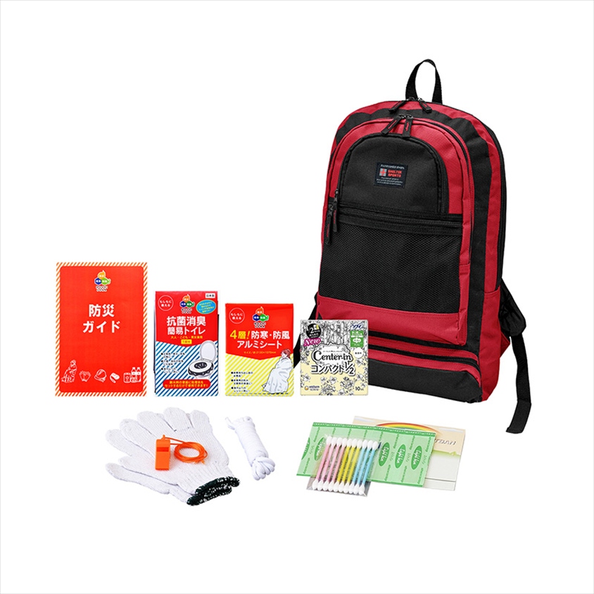 | カラー・種類 | ●セット内容:①デイパッグ、②生理用品、③4層!防寒・防風アルミシート、④抗菌消臭・簡易トイレ、⑤防災ガイド、⑥絆創膏5枚、⑦綿棒10P、⑧軍手、⑨ロープ、⑩笛 |
