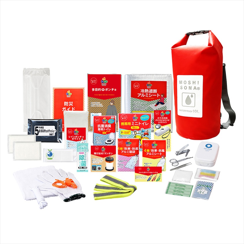 | カラー・種類 | ●セット内容:①防水deリュック、②冷熱遮断アルミシート、③多目的deポンチョ、④防災ガイド、⑤マスク、⑥スマホ対応ダイナモFMラジオLEDライト(※?)、⑦携帯用ミニトイレ、⑧抗菌消臭・簡易トイレ、⑨レインポンチョホワイト、⑩防災用ウェットティッシュ(20枚入)、⑪⑫ポケットティッシュ×2、⑬4層!防寒・防風アルミシート、⑭4層!防寒・防風アルミ寝袋、⑮飛び出せ!ランタン、⑯除菌ジェル、⑰eco便利バッグ、⑱アルミLEDライト&ホイッスル(3色アソート)、⑲新反射安全タスキ、⑳軍手、?ロープ、?笛、?タオル、?絆創膏5枚、?綿棒10P、?コットンパフ3枚、?ワンタッチ包帯、?爪切り、?毛抜き、?ハサミ(※?)携帯電話充電機能はスマートフォン対応可(一部未対応機種あり)。スマートフォンのケーブルは付属していません。 |