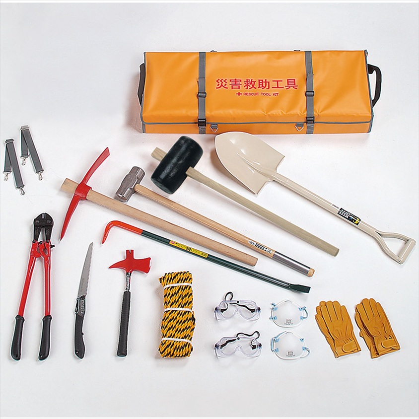 | カラー・種類 | ●セット内容:丸ショベル、防塵メガネ2個、皮手袋2双、掛矢150mm、バチツルハシ1.5㎏、両口ハンマー3.6㎏、レスキューアッキス、ボルトカッター600mm、平バール900mm、標準ロープ12mm×20m、折込鋸240mm、収納ケース |