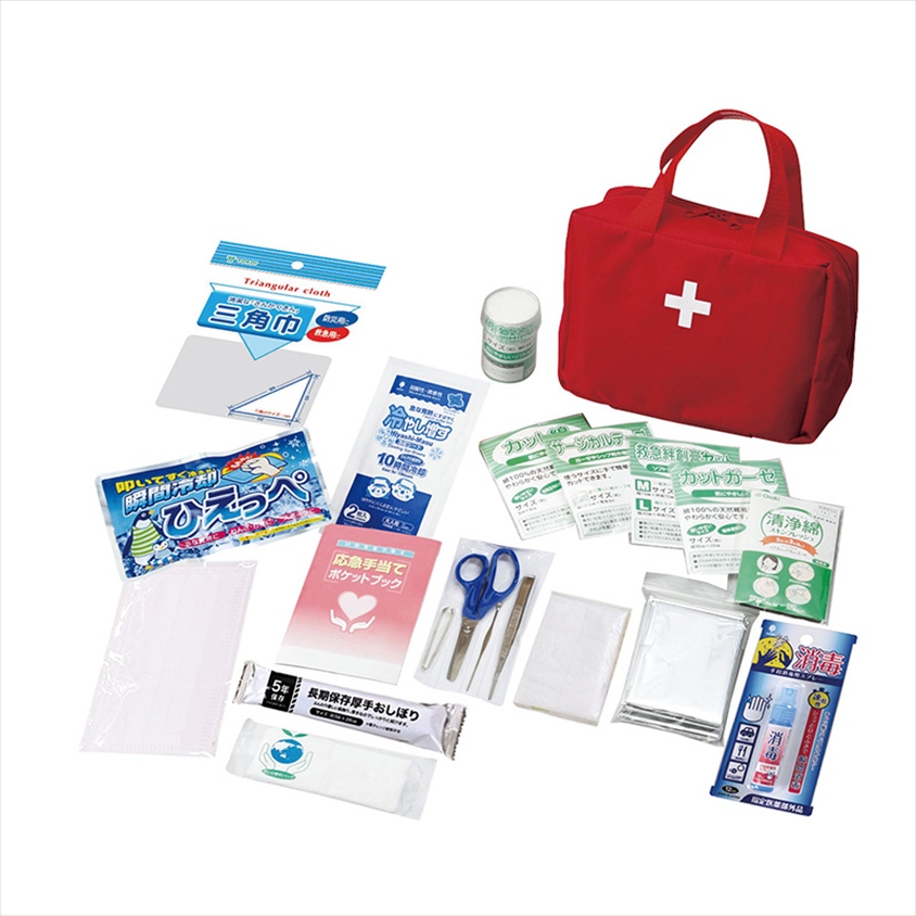 | カラー・種類 | ●セット内容:①救急バッグ、②カット綿×3枚、③カットガーゼ×3枚、④包帯、⑤救急絆創膏2サイズ×各3枚(医療機器届出番号:27B2×00110000008)、⑥サージカルテープ、⑦清浄綿 2枚入×3包、⑧ハサミ、⑨ピンセット、⑩毛抜き、⑪耳かき、⑫マスク、⑬応急手当てポケットブック、⑭冷却パック、⑮eco便利バッグ、⑯熱救急シート×2枚、⑰三角巾、⑱防寒シート、⑲手指消毒スプレー12ml、⑳ポケットティッシュ8W、?大判厚手おしぼり |