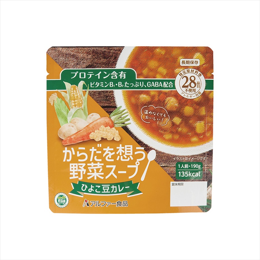 | 材質 | 野菜(スイートコーン、にんじん、じゃがいも)、ひよこ豆(カナダ又はアメリカ)、植物油、砂糖、たまねぎエキス、エンドウタンパク、トマトケチャップ、トマトペースト、食塩、カレーパウダー、酵母エキス、ガーリックパウダー、GABA/乳化剤、塩化カルシウム、ビタミンB1、ビタミンB2 |