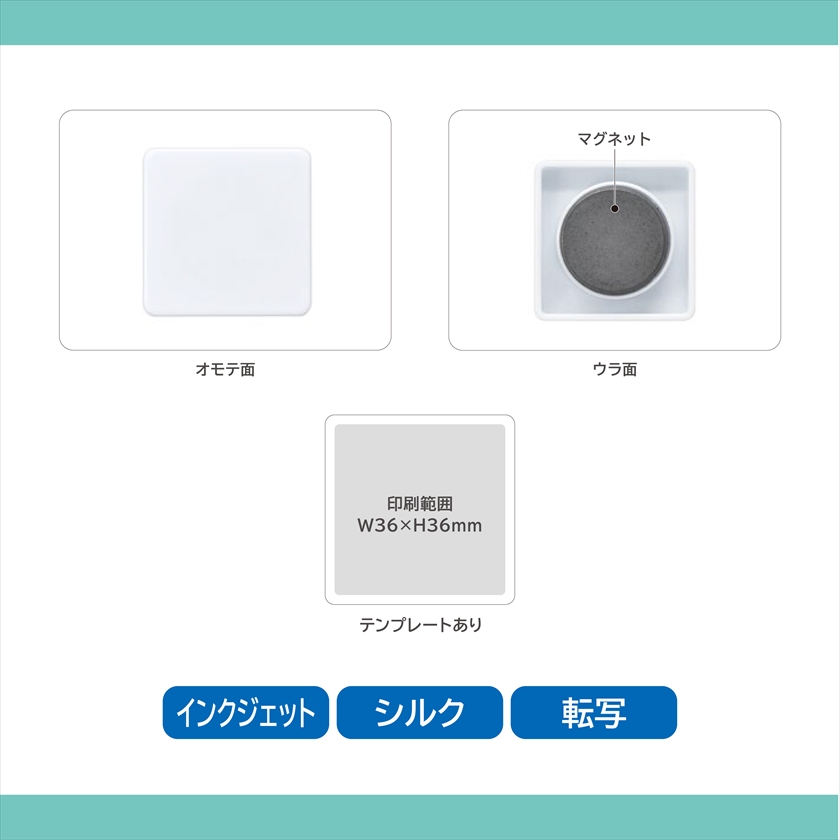 | 印刷範囲 | UVインクジェット:角型印刷範囲:W36×H36㎜(テンプレートあり) |