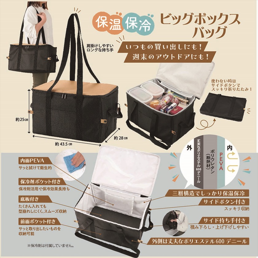 | 材質 | 本体/ポリエステル(600デニール)、内面/PEVA、持ち手/ポリプロピレン、断熱材/ポリウレタン、底板/ABS樹脂 |