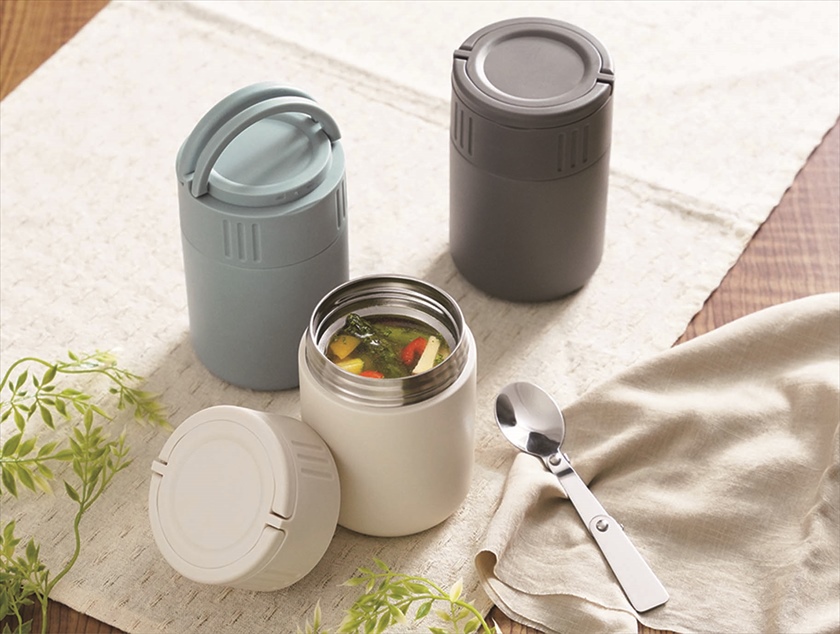持ち運びしやすい持ち手付き、小さく折りたたみできるステンレススプーン付き。ランチまで食べごろの温度をキープできる真空二重構造。