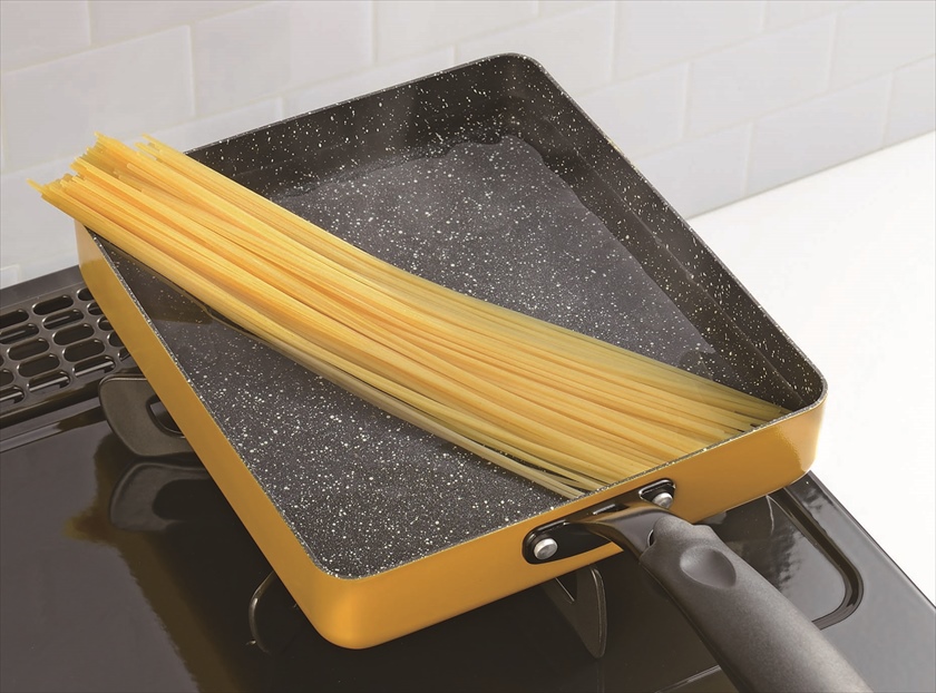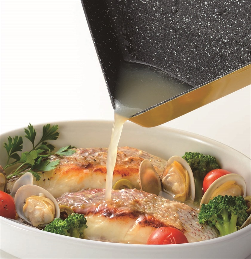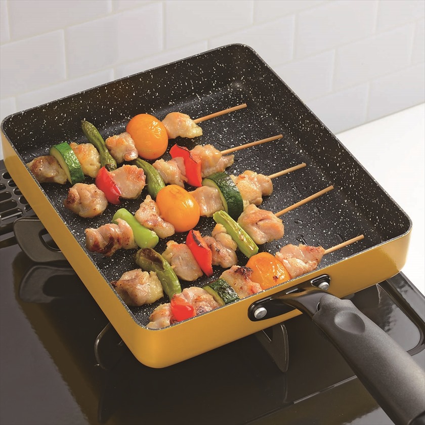 | 材質 | 表面加工/内面:ふっ素樹脂塗膜加工、外面:焼付塗装本体/アルミ(底の厚さ2.3mm)、はり底/18-0ステンレス、取手/フェノール樹脂 |