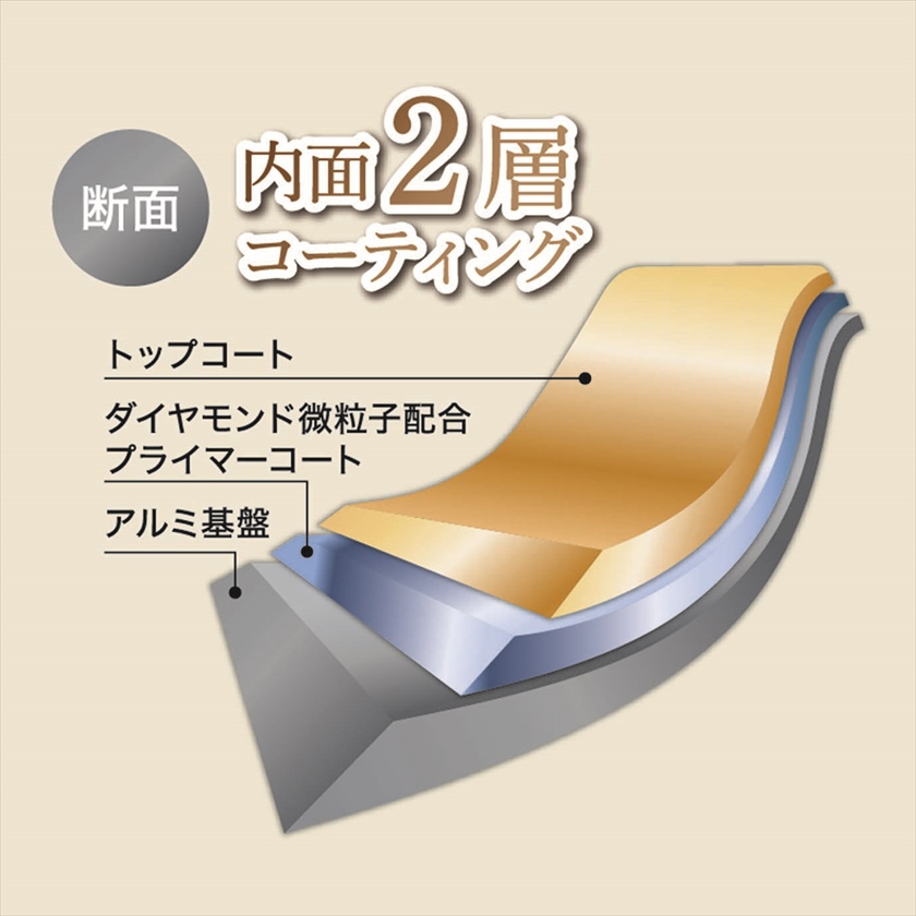 | 材質 | 表面加工/内面:ダイヤモンド微粒子配合ふっ素樹脂加工、本体/アルミニウム合金(底の厚さ2.3mm)、はり底/18-0ステンレス鋼、取手/フェノール樹脂(木目調転写) |