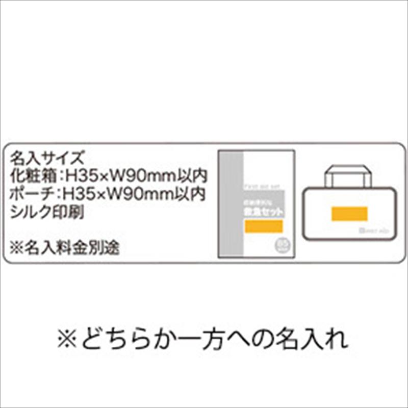 | 備考 | 収納ポーチ・抗菌伸縮包帯・カイロ・救急てぬぐい・折りガーゼ・除菌アルコールウェットティッシュ・マスク・ホイッスル・瞬間冷却パック・アルコールハンドジェル×3・綿棒10P・絆創膏5P・水に流せるペーパー・ゴム手袋・ひょうのう・エチケット6P・ボディタオル/※セット商品の色・柄は写真と異なる場合があります/個人宅宛・航空便は対応不可 |