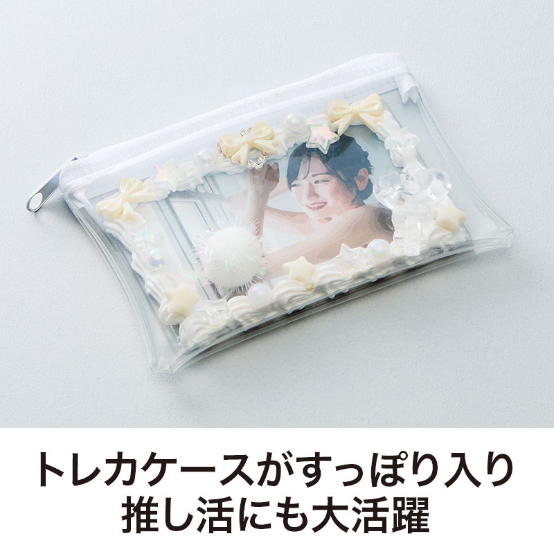 トレカケースがすっぽり入るサイズ感で、デコレーションしたカードの保護や持ち運びにも役立ちます。