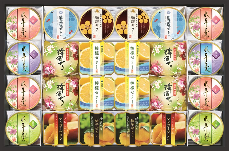 | カラー・種類 | 金澤オリジナル珈琲ゼリー 52g×2個、能登塩ぜりぃ 52g×2個、水羊羹小倉 60g×4個、水羊羹練り 60g×2個、水羊羹抹茶 60g×2個、梅酒ぜりぃ 75g×4個、能登塩入り檸檬ゼリー 75g×4個、プレミアムマンゴープリン 75g×2個、蜂蜜入り柚子ぜりぃ 75g×2個 |