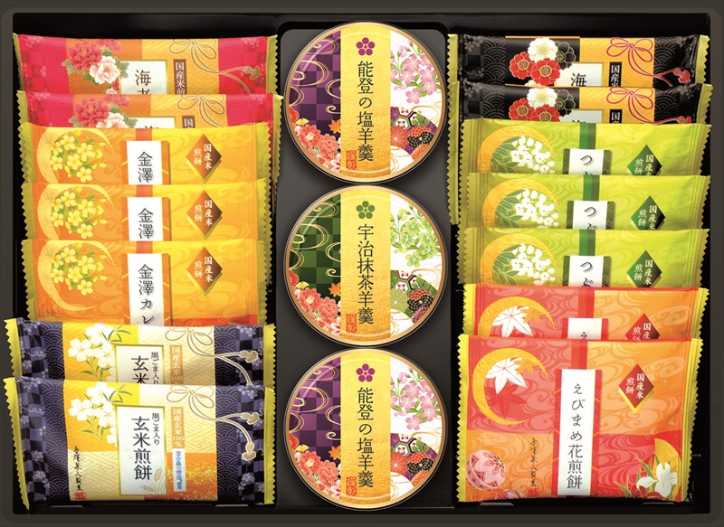 | カラー・種類 | つぶやきサラダ×3枚、金澤カレー煎餅×3枚、えびまめ花煎餅×2枚、海老胡椒煎餅×2枚、黒ごま入り玄米煎餅×2枚、海老カレー煎餅×2枚、能登の塩羊羹60?×2個、宇治抹茶羊羹60?×1個 |