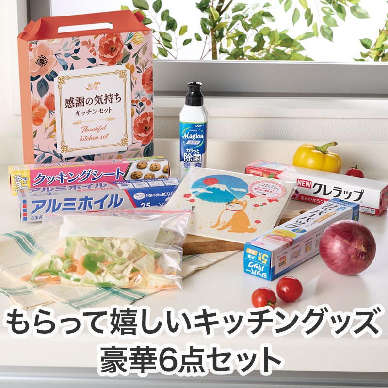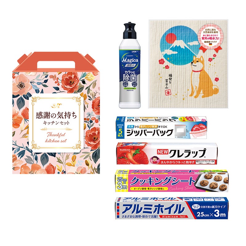 | 備考 | 内容:ライオン CHARMY Magica(速乾+カラッと除菌 シトラスミントの香り) 220ml・NEWクレラップ22cm×10m・ジッパーバッグ(5枚入)・アルミホイル25cm×3m・クッキングシート25cm×3m・エコふきん 各1食品検査済(クレラップ・ジッパーバッグ・アルミホイル・クッキングシート) |