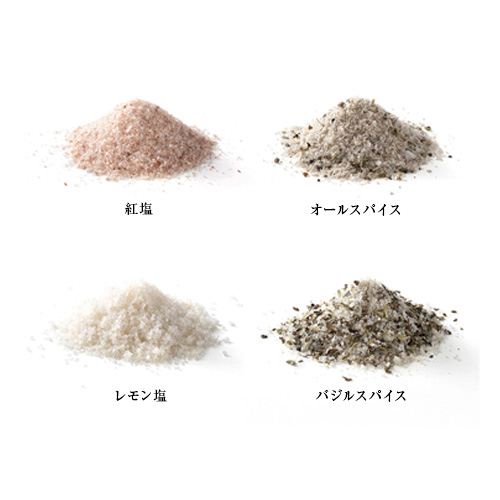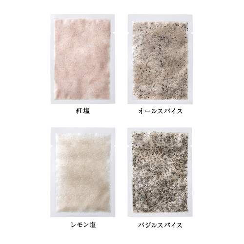 | カラー・種類 | 紅塩15g×1、レモン塩15g×1、オールスパイス10g×1、バジルスパイス10g×1 のいずれか1個【種類の指定はできません】 |