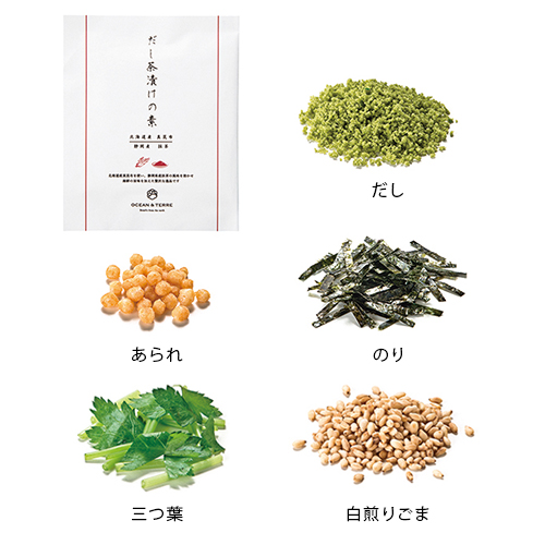 | カラー・種類 | だし茶漬けの素4.5g×3、紅鮭1切×1、紀州南高梅1粒×1、宍道湖しじみ30g×1、白煎りごま1g×3 |
