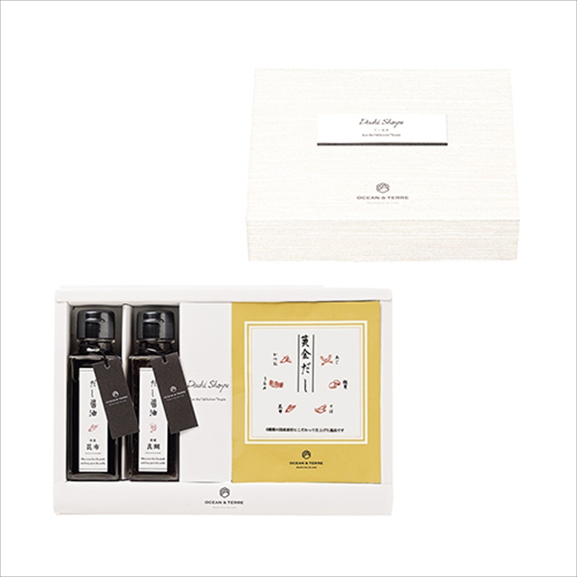 | カラー・種類 | 北海道日高昆布醤油100ml×1、愛媛県真鯛醤油100ml×1、黄金だしパック8g×8 |