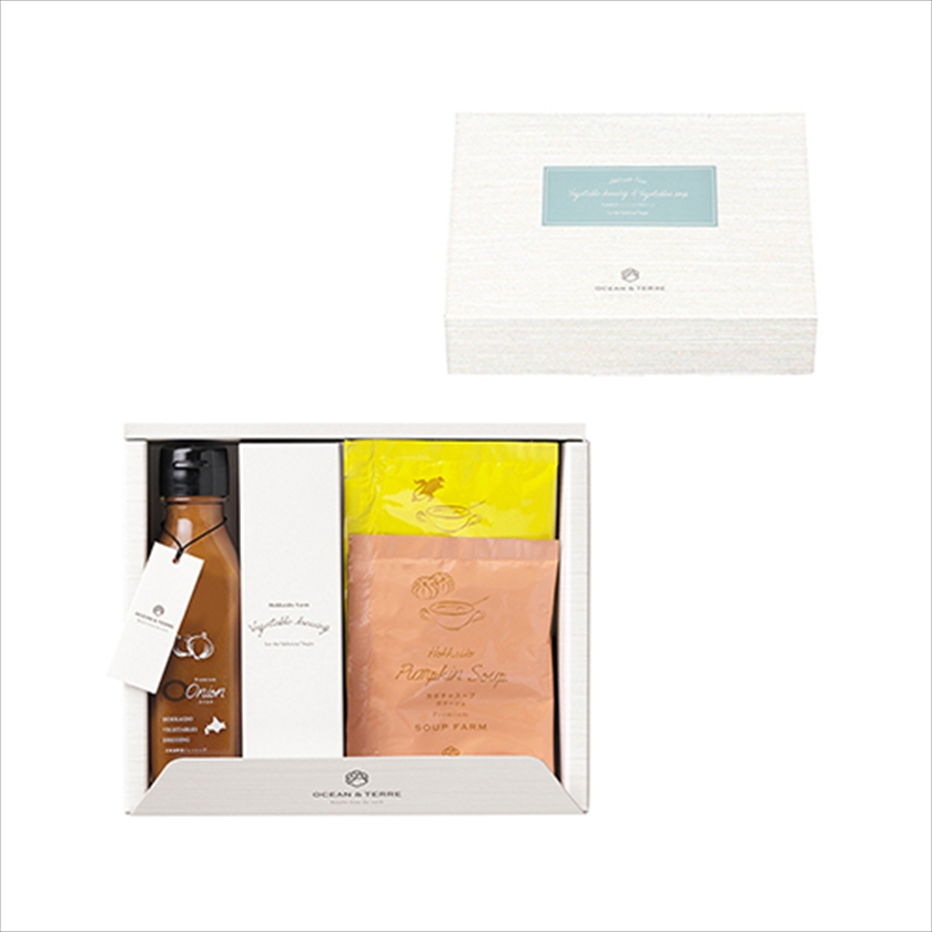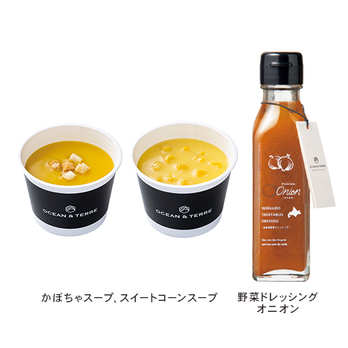 | カラー・種類 | 野菜ドレッシングオニオン120ml×1、北海道産かぼちゃス-プ16.5g×1、北海道産スイートコーンス-プ16.5g×1 |
