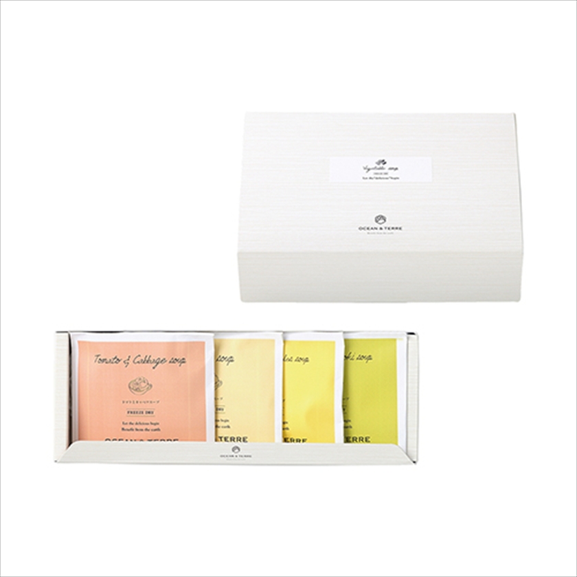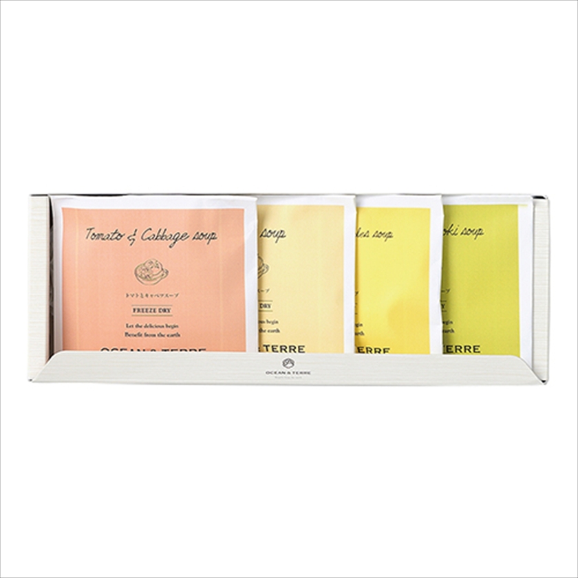 | カラー・種類 | ザク切りキャベツとトマトのスープ6.9g×1、あめ色玉ねぎのスープ5.2g×1、野菜とたまごのスープ4.7g×1、しめじとえのきの和風スープ5.0g×1 |
