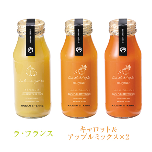 | カラー・種類 | アップルジュース180ml×1、ミカンジュース180ml×1、キャロット&アップルミックスジュース180ml×2、ラ・フランスジュース180ml×1 |