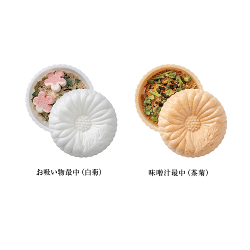 | カラー・種類 | お吸い物最中(白菊)7.3g×8、味噌汁最中(茶菊)10.5g×7※もち米 100%(国産)最中種 |
