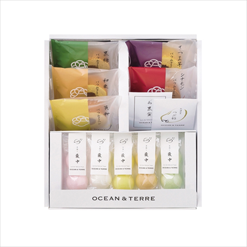 | カラー・種類 | 黄粉バーム×1、黒糖バーム×1、シナモンバーム×1、さつま芋バーム×1、和栗バーム×1、黒蜜10g×1、最中1.6g×5、粒あん35g×2※もち米 100%(国産)最中種 |