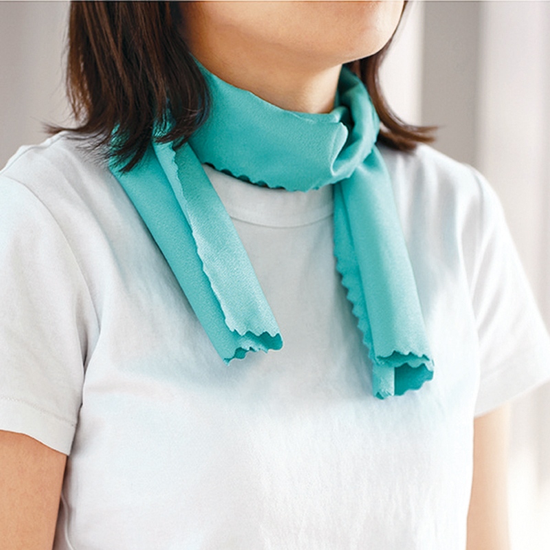 水に浸したら、絞って水を切るだけ。冷えたスカーフを首に巻けば、外出や作業がラクになります。