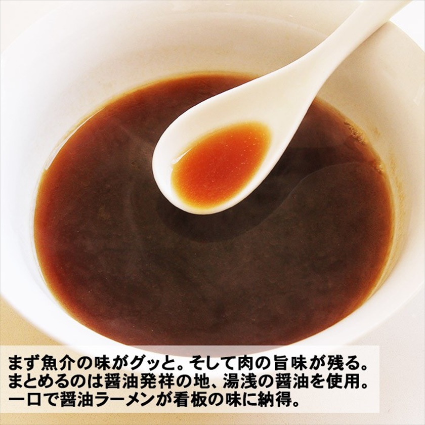 | 材質 | 麺(小麦粉(国内製造)、小麦蛋白、還元水飴、食塩/加工澱粉、酒精、かんすい、(一部に小麦を含む)) スープ(たん白加水分解物(国内製造)、魚介エキス、しょうゆ、食塩、豚脂加工品、香味食用油、チキンエキス、砂糖、いわし煮干し粉末、そうだがつおぶし粉末、昆布エキス、生姜粉末/調味料(アミノ酸等)、酒精、カラメル色素、加工でんぷん、酸味料、酸化防止剤(V.E)、(一部に小麦・大豆・豚肉・鶏肉を含む)) |